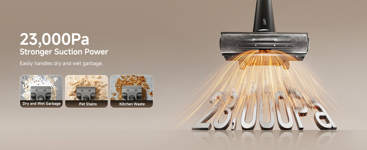 - 23000Pa Strong Suction with 3 Modes: Smart Cleaning Mode automatically adjusts suction via AI, balancing cleaning power and runtime. MAX mode tackles tough stains. Dry mode cleans dry debris without water.