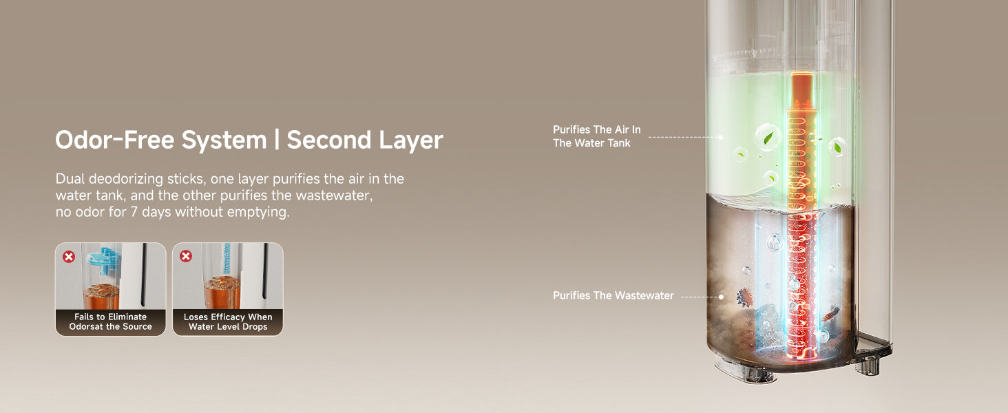 - Triple Odor Removal: Dual odor-removal sticks keep water odor-free for 7 days without water changes.It has an industry-first IPX6+ washable roller brush that cleans in 5 minutes, 100℃ hot water and air sterilize to remove odors.