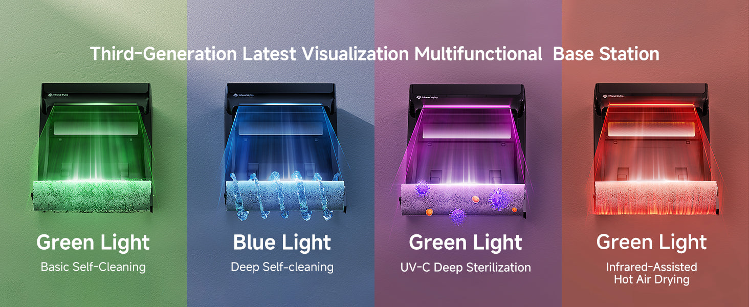 - Smart RGB Self-Cleaning Base Station: Just push it into the station for one-stop cleaning, green light for dust cleaning, blue light for deep cleaning, Uv-C light for sterilization, and red light for drying. 100% dry and clean results are achieved.