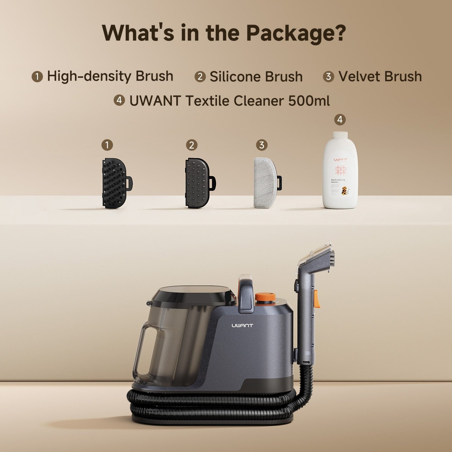 What Includes: We provide the necessary accessories for cleaning with the rug cleaner, a high-density brush head, a silicone brush, a velvet brush, and self cleaning brush head also specialized cleaning solution.