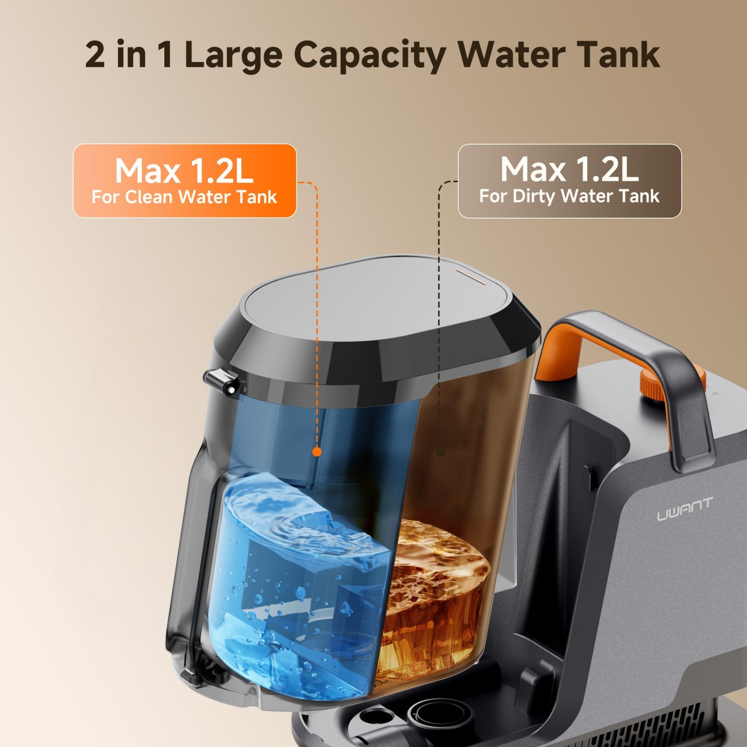 2 in 1 Water Tank: The portable cleaner machines' exclusive water tank design eliminates the need to frequently clean different water tanks, and they all have 41oz. You can cleane the clean water tank and waste tank at the same time with one hand.